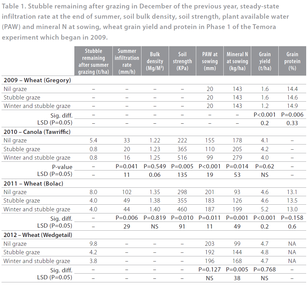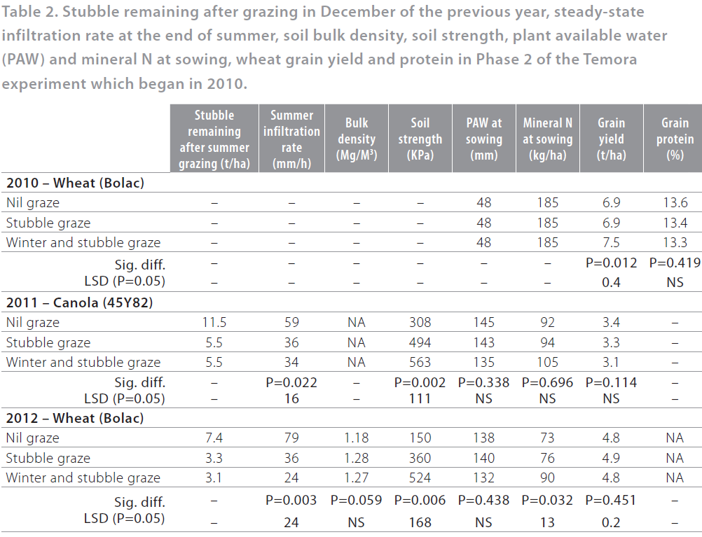 In the set-up year of Phase 2 (2010), winter grazing of the crop increased yield by 0.6t/ha (Table 2). There were no effects of grazing on yield in either 2011 or 2012. Grazing reduced infiltration and increased soil strength in both 2011 and 2012, but not to levels likely to reduce fallow efficiency or decrease yield.