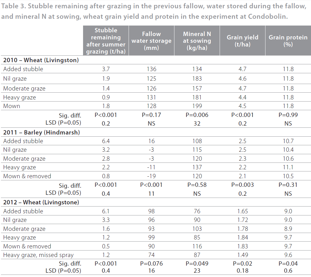 In 2012 a treatment which was heavily grazed, and in which summer weeds were not controlled, had accumulated less soil water and had less mineral N prior to sowing. It yielded less than all other treatments apart from the added stubble treatment. This reinforces the importance of summer weed control for maximising summer fallow efficiency and subsequent crop yield. The heavily grazed and stubble cut and removed treatments yielded marginally more than the nil graze treatment. Grain proteins indicate that this was probably due to the differences in mineral N apparent at the start of the season (Table 3).