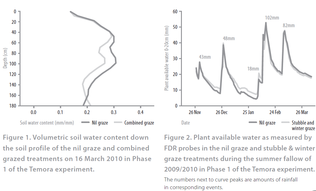 In the set-up year of Phase 1 (2009), winter grazing of the crop reduced yield by 0.4t/ha and protein increased accordingly. The nil graze treatment accumulated more water during the summer fallow period, following significant and intense rain in mid-February and early March (Table 1). The extra water accumulated was stored deep in the profile (Figure 1), indicating that the difference in accumulation was due to improved infiltration in the presence of stubble rather than reduced evaporation. This hypothesis is supported by measurements of soil water at the surface which showed no difference between the nil graze and winter and stubble grazed treatments (Figure 2).