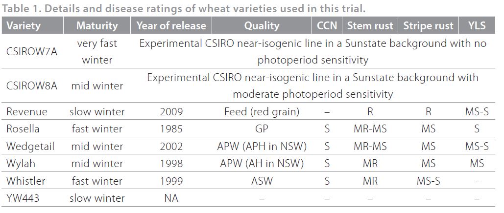Wheat varieties: CSIROW7A, CSIROW8A, Revenue, Rosella, Wedgetail, Wylah, YW443 and Whistler