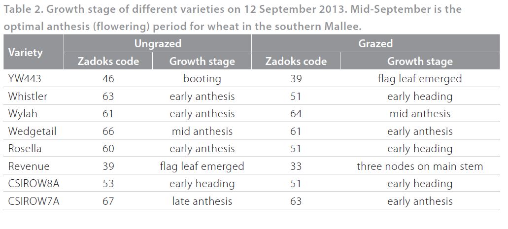 All varieties matured differently, with YW443 and Revenue being the last two varieties to reach anthesis (Table 2). Varieties that had not been grazed were slightly more advanced than those that had, with the exception of Wylah and CSIRO W7A, where grazing seemed to accelerate development. Whistler, Wylah, Wedgetail and Rosella all flowered in mid-September, which is the time most optimal for yield potential in the southern Mallee (i.e. at the same time as a spring wheat such as Scout sown in late April or early May).