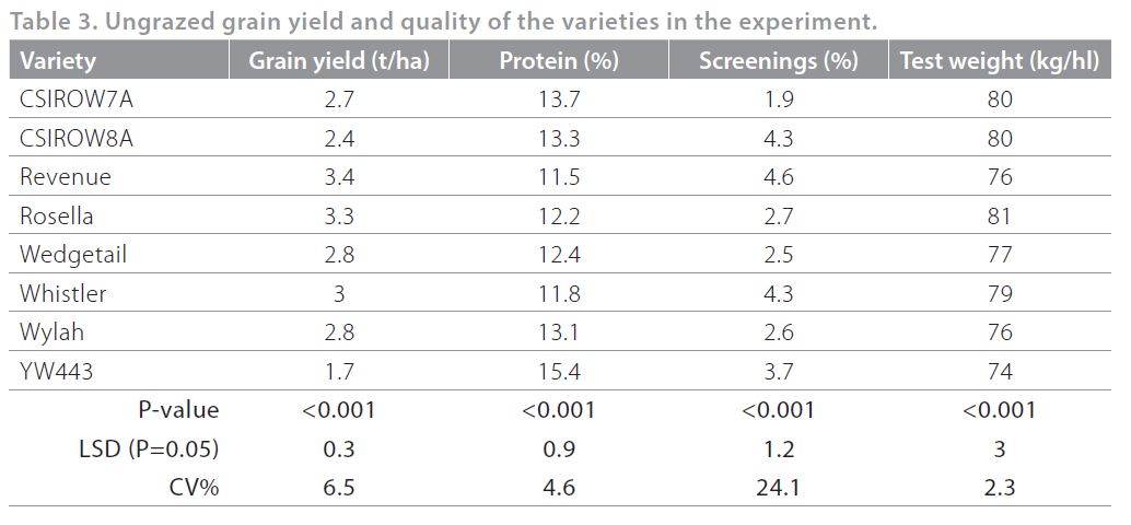 Revenue and Rosella achieved the highest yields, followed by Whistler, Wedgetail and Wylah (Table 3). There was no varietal interaction with grazing which, on average, reduced grain yields by 0.3t/ha. The yield of Revenue was particularly impressive given its late flowering.
