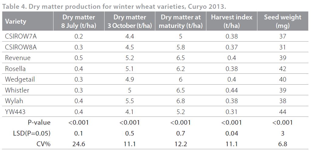 YW443 measured a significantly lower harvest index than the other varieties. This is mainly due to it being significantly the lowest yielding variety, as shown in Table 3. It is a Chinese winter wheat with clearly very poor adaption to the Mallee!