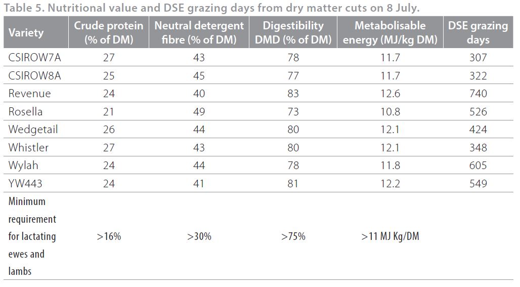 Tissue tests conducted on dry matter cuts taken on 8 July indicated that all varieties, with the exception of Rosella, had adequate nutrition to meet the minimum requirements for lactating ewes and lambs (Table 5). Revenue and Wylah would have been able to sustain the greatest number of grazing days.