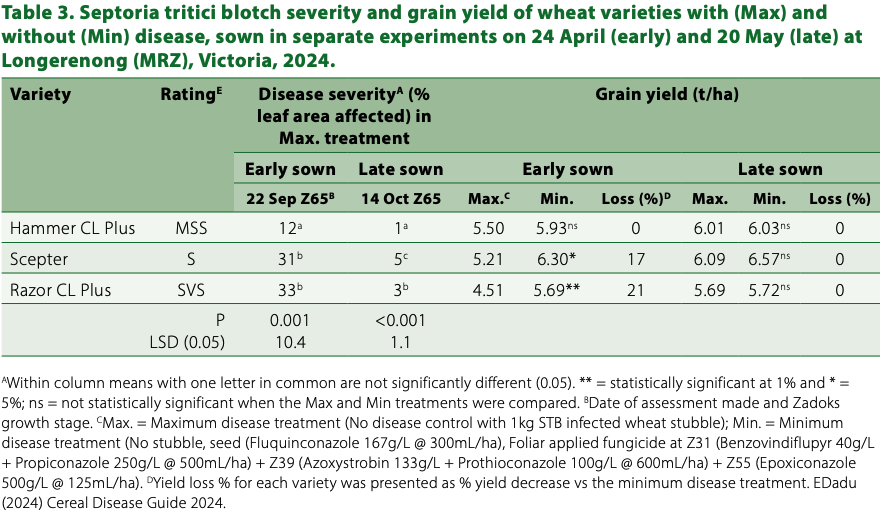 - Septoria tritici blotch (STB) reduced grain yield in highly susceptible wheat varieties by 21 per cent in the MRZ (Wimmera) during 2024. However, yield losses may be reduced if sowing time can be adjusted as part of integrated control of STB.