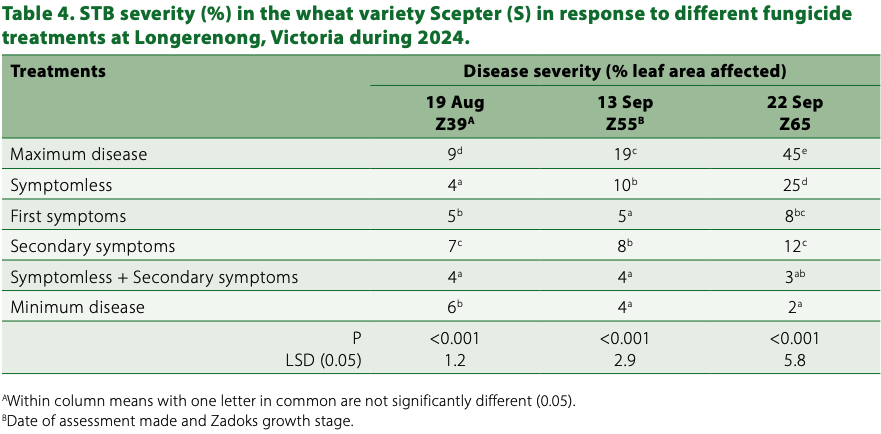 In this experiment, the first symptoms of STB were detected on the lower canopy at stem elongation stage (Z37), much later than the traditional stage (Z31) routinely used for fungicide application. The secondary symptoms were marked as symptom appearance on the flag leaves, which were detected around the early booting stage (Z41). Given the below average seasonal conditions during 2024, single fungicide applications at either of the growth stages provided levels of protection from STB equal to a dual or a triple application strategy. This supported previous season results that use of multiple fungicide applications would not be economical in seasons with dry weather.
