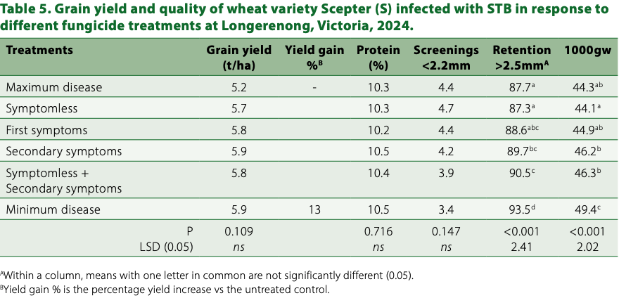 Fungicides effectively suppressed STB infection in Scepter (S) and increased grain yield by 13 per cent when compared to the untreated treatment (Table 4). In addition, grain retention and thousand grain weight were also improved (Table 5). Fungicides were more effective when applied after STB symptoms were detected in the crop. This finding contradicts the general consensus that preventative applications are more effective for STB control. However, a pre-emptive foliar application alone did not provide complete control and an additional application was needed, increasing the economic cost of the management. The long latent period (~30 days), which is the time between infection and appearance of first symptoms, poses challenges for timely fungicide application. Delaying application could lead to underestimation of the disease risk and lead to yield loss, while applying too early may result in suboptimal control.