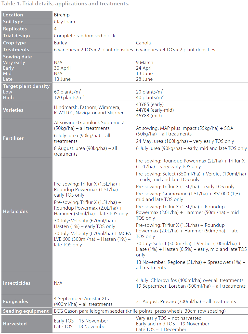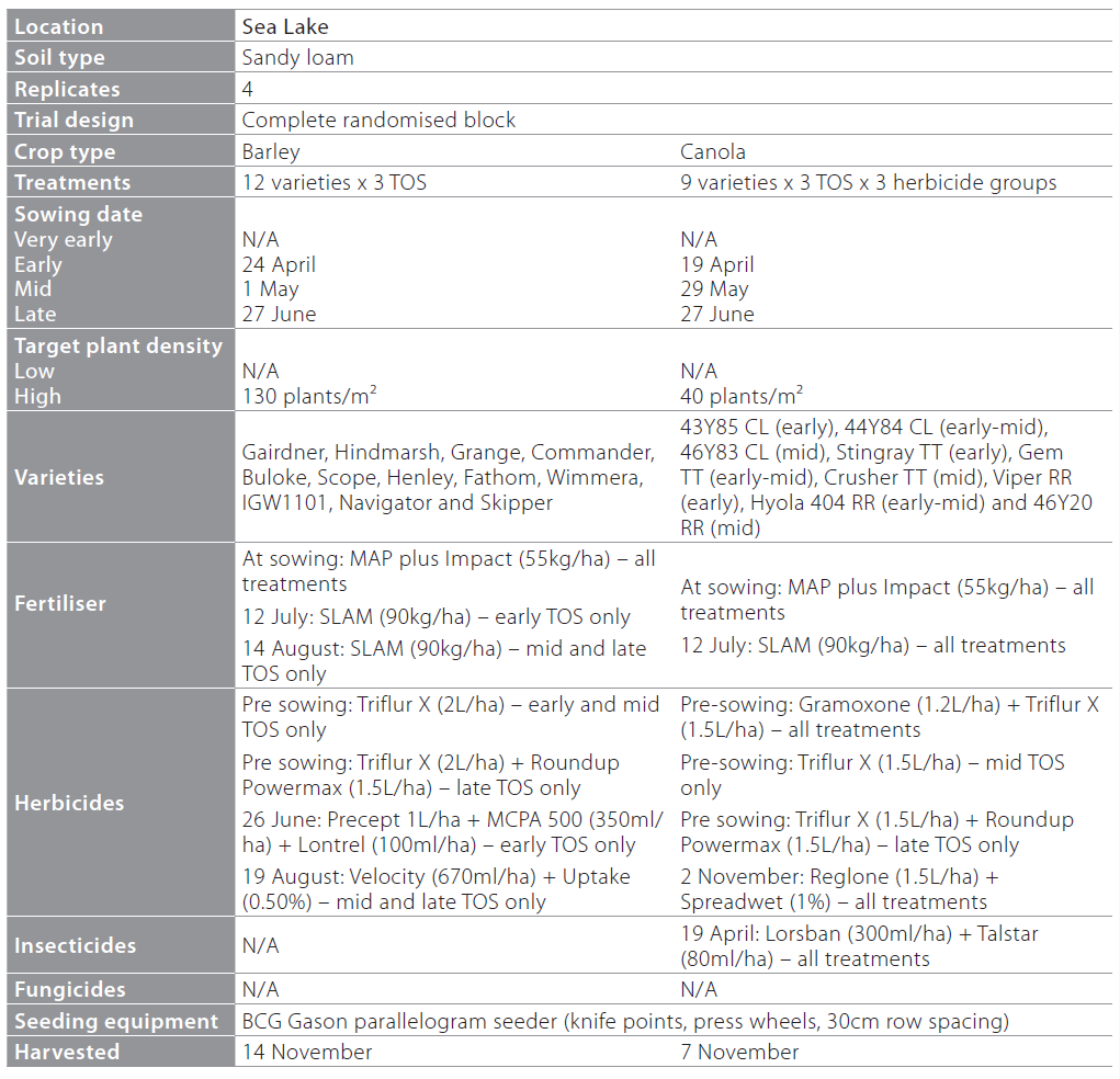 Time of sowing barley and canola trials were established at Birchip and Sea Lake. Each trial incorporated different treatment factors around the TOS. Table 1 outlines the trial details, applications and treatments. Each trial was replicated four times and managed to maximise yield (e.g. weed and disease free). Nitrogen applications were based on crop requirements determined by soil testing and Yield Prophet®. Emergence was scored on trials where this was an issue.