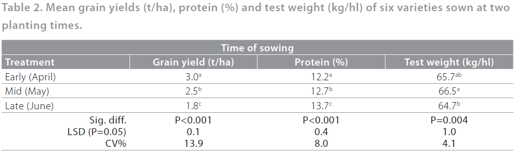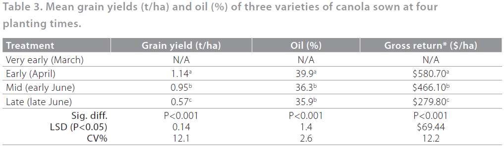 • In 2012, early sown barley and canola gave the highest yields and gross returns. The early sown crops were able to withstand frosts and avoid the worst of the dry spring.