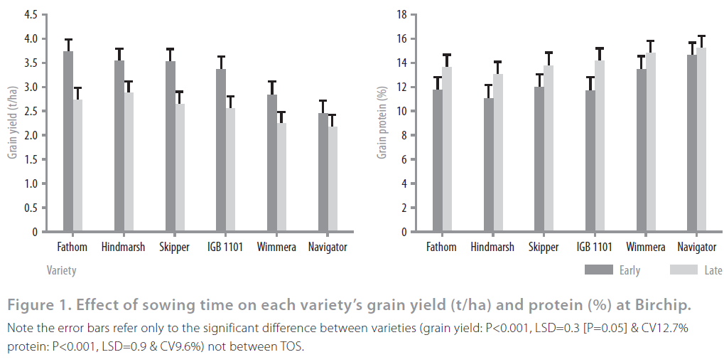 Figure 1 shows the effect of sowing time on each variety’s grain yield (t/ha) and protein (%) at Birchip. Fathom, Hindmarsh, Skipper and IGB 1101 had significantly higher yields than Wimmera and Navigator for both TOS. As noted previously, the seed source of Navigator was believed to be poor. In the early TOS results, Wimmera and Navigator had significantly higher protein than the remaining varieties. For the late TOS, Wimmera and Navigator were significantly higher than Hindmarsh only. No significant interactions were observed in this trial between variety TOS and plant density.
