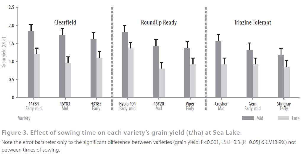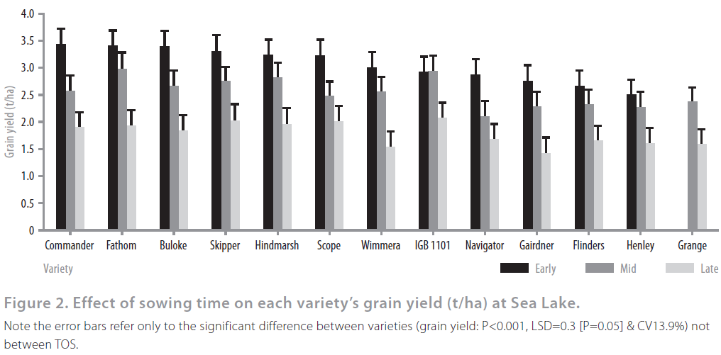 At Sea Lake Commander, Fathom, Buloke and Skipper topped the yields for the early TOS and were significantly higher than all remaining varieties apart from Hindmarsh and Scope (Figure 2). Fathom, IGB1101, Hindmarsh and Skipper topped the yields for the mid TOS and were significantly higher than all remaining varieties apart from Buloke, Commander, Wimmera and Scope. IGB1101, Skipper, Scope, Hindmarsh, Fathom, Commander and Buloke topped the yields for the late TOS and were significantly higher than Wimmera and Gairdner only. As noted previously, the seed source of Gairdner and Navigator was believed to be poor. No significant interactions were observed in this trial between variety and TOS. However, IGB1101 was one of only two varieties which produced comparable yields for both of the early and mid TOS. Henley was the other.