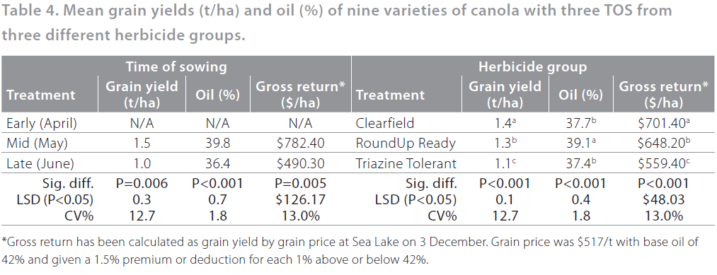 All treatments in this trial produced significant results in grain yield, oil percentage and gross return, but no interactions were realised between treatments (Table 4). Consistent with the Birchip trial, the mid TOS produced significantly higher grain yield, oil percentage and gross return than the late TOS.