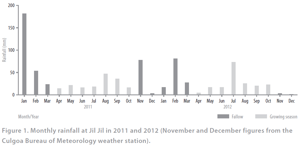 Termination trade-offs are heavily influenced by what the season is like for the pasture, and for the crop that follows it. The 2011 season was quite exceptional, with relatively dry winter/springs (164mm April- October in 2011 and 174mm in 2012) following a record-breaking wet summer in 2010/11 and good rain in summer 2011/12 (Figure 1). Rainfall distribution in the 2012 growing season was more favourable than in 2011, with fewer but bigger, rainfall events and 59mm over three days in July. Rainfall events were small in the 2011 growing season, with only two single day totals above 10mm until the end of September. In the 2011 summer especially there was a good opportunity to store water.
