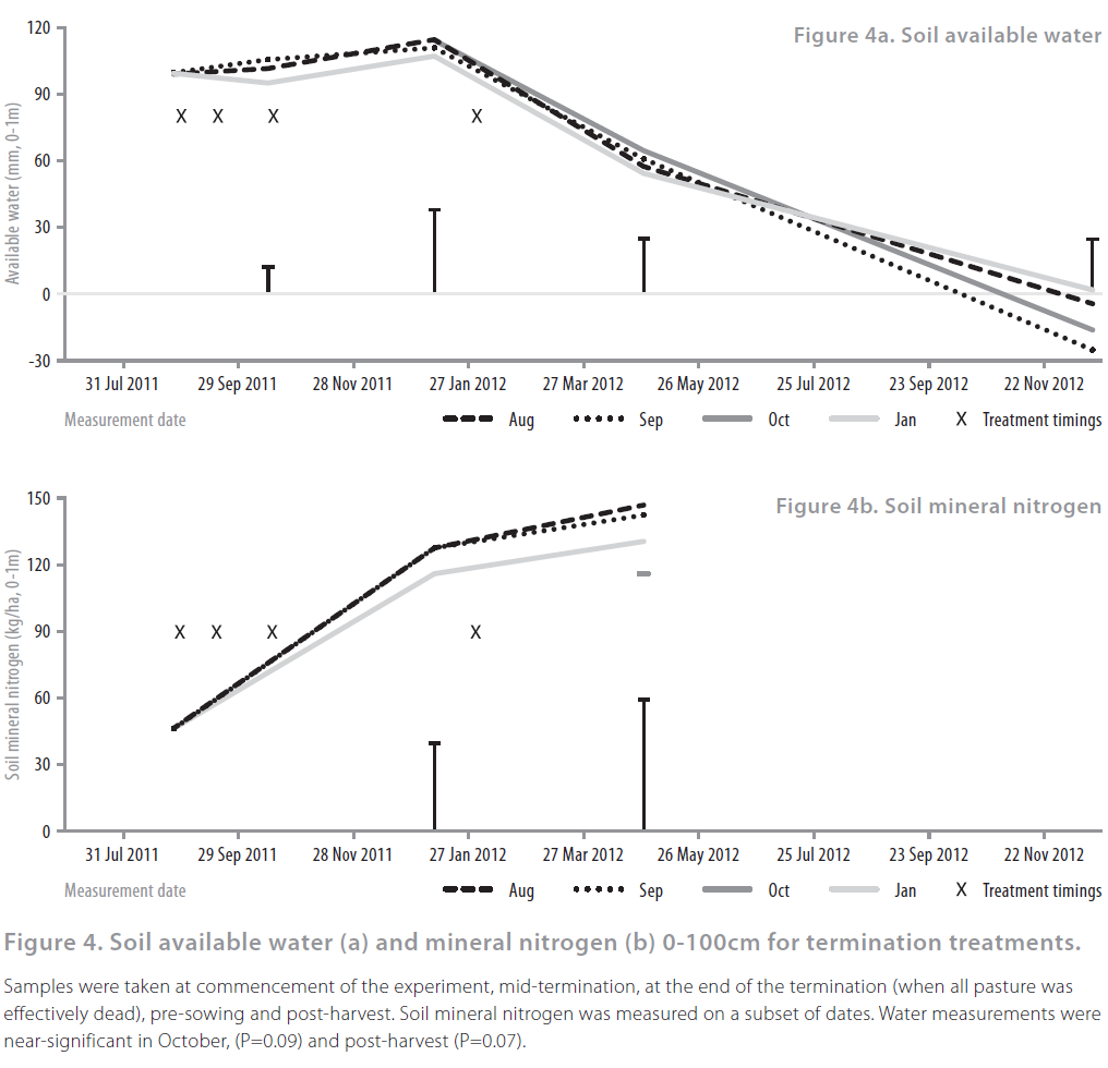 Soil available water was not significantly lower in the January termination treatment in October (P=0.09), compared with the September termination treatment (Figure 4a). The January treatment remained driest until the post-harvest measurement, when it was wettest (again, compared to the September treatment, P=0.07). Soil mineral nitrogen also tended to be lower for the January treatment, compared to the earlier termination treatments (Figure 4b). Again, measurements were quite variable (CV16-22%, LSD=40-60kg N/ha).
