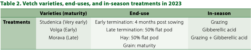 To evaluate the effect of vetch variety choice, end-use and in-season decisions on the yield and grain quality of a subsequent wheat crop.