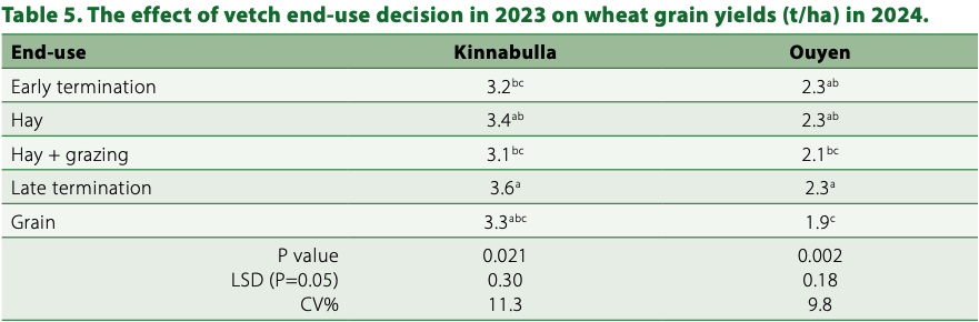 Of all the end-use treatments, the late termination and hay end-uses of vetch in Year 1 were the only treatments to consistently show improved wheat yields in Year 2 (Table 5). Early termination and grain end-use legacy effects on yield were inconsistent, showing no trends at the two sites. The hay treatment was not expected to have a significant legacy effect on yield, as 3–6t/DM/ha of biomass removed is likely to result in less mineralisation compared to the brown manure treatments. This is consistent with observations reported previously in other studies (Grain Orana Alliance, 2024; Browne et al., 2012).