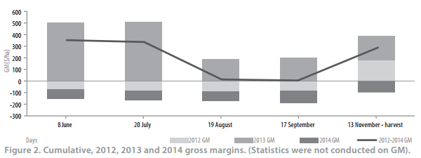 Cumulative gross margins from 2012-2014, revealed that the June and July vetch termination treat ments made a three year profit of $348/ha and $331/ha (Figure 2). These gross margins resulted from higher wheat yields in the first wheat crop after vetch due to increased soil water.