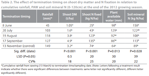 For the termination timing trial, five different termination timings were imposed; 8 June (three months after sowing), 20 July, 19 August, 17 September, and 13 November (harvest control). Herbicides used to carry out termination treatments were 2L/ha glyphosate and 300ml/ha of LontrelTM, followed a week later with 1.5L/ha Gramoxone® 250 (double knock).