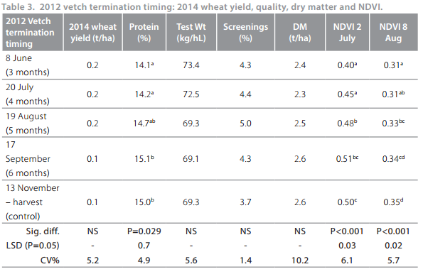 Due to a very dry year in 2014 (Table 1), yields were very low and essentially the wheat crop ‘failed’. Higher protein and NDVI measurements occurred in treatments where vetch was terminated late in 2012 and where the wheat crop hayed off in 2013. These results suggested that carryover nitrogen was possibly greater in these treatments. However, this trend was insufficient to translate into dry matter (DM), test weight or yield differences, which probably is a reflection of the dry spring.