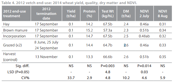 Very low wheat yields and high protein also resulted following treatments where vetch was terminated in spring at peak biomass with different end-uses in 2012. (Table 4).