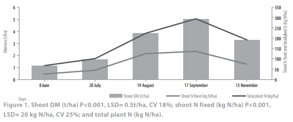 Vetch biomass production in 2012 ranged from 1t/ha in June to 5t/ha in September at peak biomass. Shoot N fixed ranged from 25kg N/ha in June to 135kg N/ha in September (Figure 1 and Table 2). When the biomass was multiplied by shoot N content (4%) and multiplied by a below ground root factor of 1.5 (Peoples, pers.com), N produced by the whole plant ranged from 63kg N/ha to 294kg N/ha.