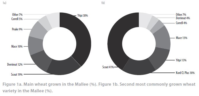 At BCG’s annual Trials Review Day in February 2013, growers were asked which varieties they grow. There were 156 growers surveyed, the majority being from the Mallee (113 respondents) and the rest from the Wimmera (43 respondents). The growers were asked to nominate their main wheat variety and their second most commonly grown variety. The survey showed that in the Mallee, Yitpi is still the dominant variety, despite many believing Scout and Mace had superseded it since 2011 when stem rust was found in crops for the second year in a row. When looking at the second variety grown, the per cent (%) of Scout, Kord CL Plus and Mace all increased, while Yitpi decreased from 39 per cent to 13 per cent.