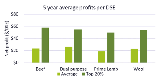 This is demonstrated in the graph below, showing that on average, there was very little difference between breeding livestock enterprise profit per dry sheep equivalent (DSE) (the greatest difference is $7.30/DSE between dual purpose and prime lamb enterprises), compared to the large difference between the average and the top 20 per cent producers (about $30/DSE, 4 times higher net profit) seen for all enterprises. Â